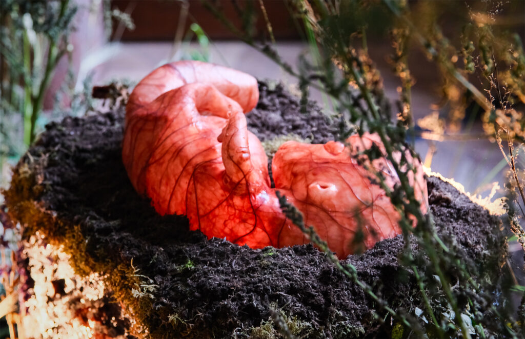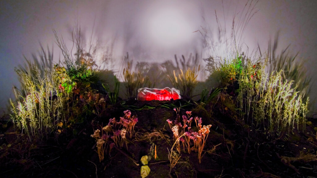 Visitors enter a room that functions as a ‘living cathedral,’ where the air is thick with the scent of damp earth and dried flora. At the center, atop an elevated altar, lies Perlijn: a 3D-modeled sculpture that pulses with a rhythmic light.