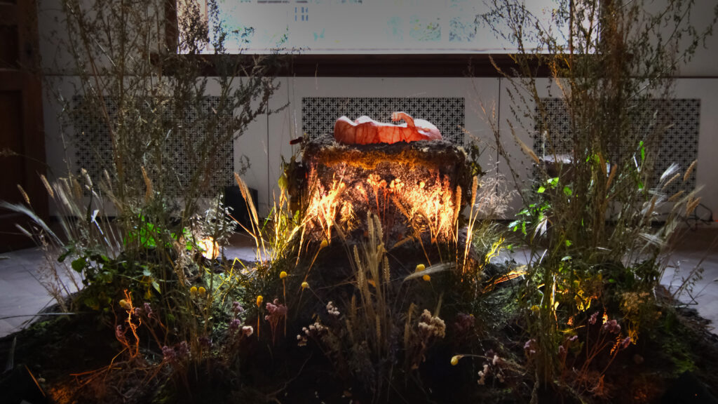 The installation unfolds through a contemporary fable, a story of a mysterious organism born into a world defined by utility. Found in a sheep stable but possessing no fleece, Perlijn is an unknown entity that exists outside of capitalist value or agricultural function. When the farmer, seeing no use for her, attempts to slaughter her, Perlijn escapes, returning to the earth to plant herself, eventually flourishing into the living cathedral that now surrounds the visitor. This origin story serves as an interruption to centuries of habit, marking the transition from consumption to communion.